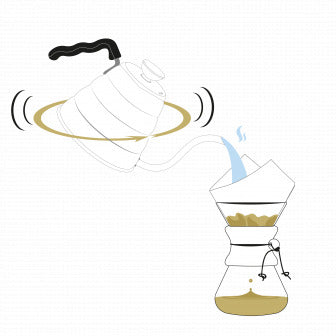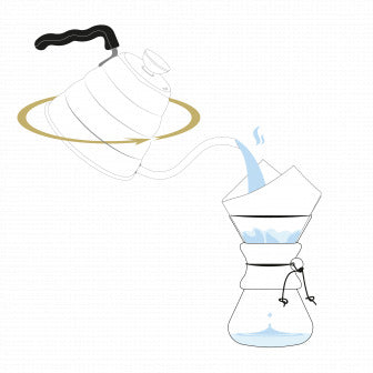 94° heißes Wasser in kleinen Mengen auf das Kaffeepulver geben, aber immer nur so viel, dass es quellen (bloomen) kann, 30 Sekunden lang.