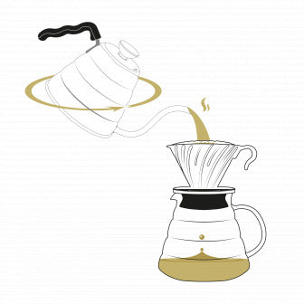 Kaffeemehl in den Filter geben und das Wasser kreisförmig von innen nach außen einfüllen. Kaffeemehl mit Wasser bedecken und nach 20s - 30s das restliche Wasser langsam und gleichmäßig auffüllen.